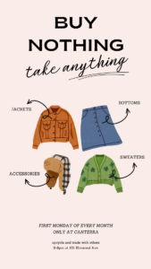 Join us for the monthly Buy Nothing, Take Anything Swap right at Canterra. It’s all about sharing and swapping cool stuff with your neighbors—no money needed! Bring what you no longer need and grab something new to add to the wardrobe. Perfect way to declutter and score some awesome finds.