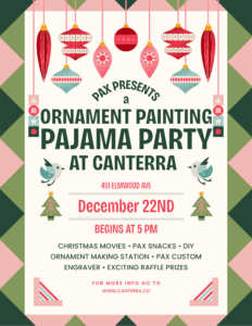 Get ready for a fun-filled day at Canterra! Join us for the PAX DIY Ornament Painting session and rock your comfiest pajamas. It’s all about relaxing, creating cool ornaments, and having a blast in person. Perfect for those who love holiday vibes and chill vib